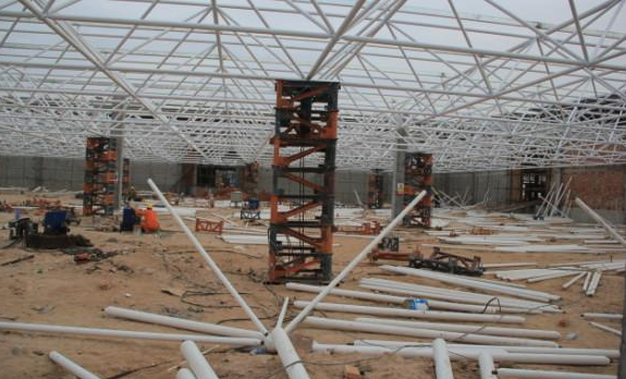 5)总体晋职法:此步履多使用在周边支护以及有多点支护的网架结构,可采取平板升降机、液压千斤顶等小型机具作业河源施工;